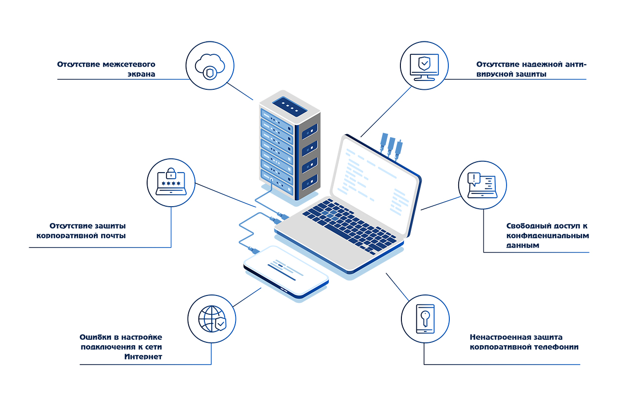 Обнаружить возможные «проблемные зоны» и риски, связанные с работой серверов, локальных вычислительных сетей, рабочих станций сотрудников, интернет-каналов, почтовых ящиков и прочих компонентов сетевой инфраструктуры.